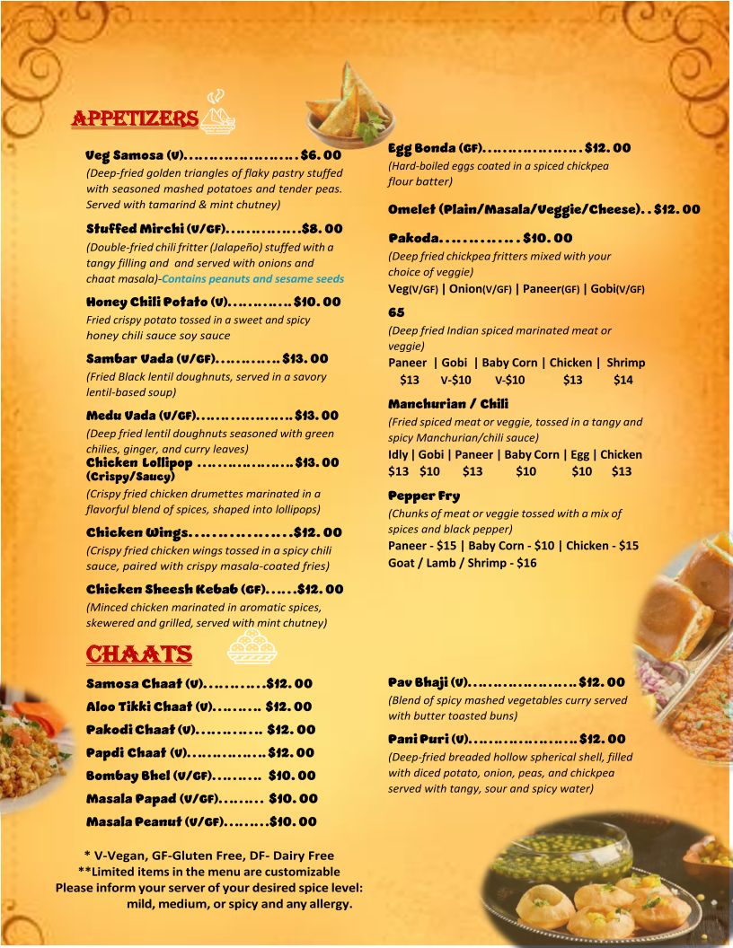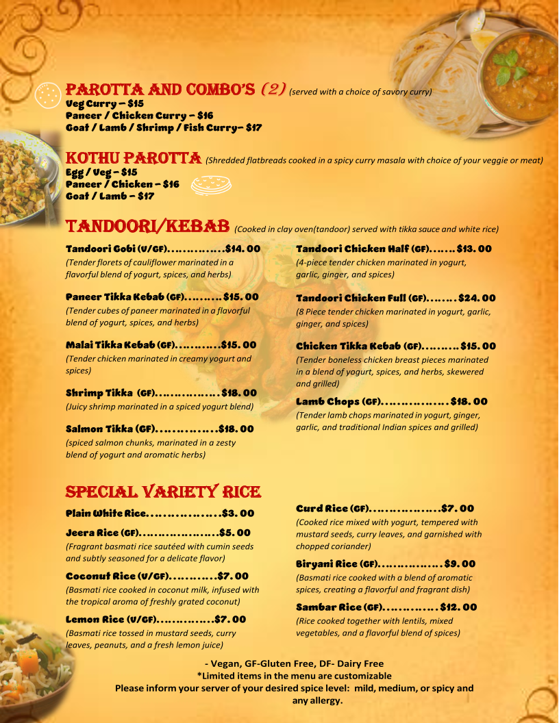 Shredded flatbreads cooked in a spicy curry masala with choice of your veggie or meat